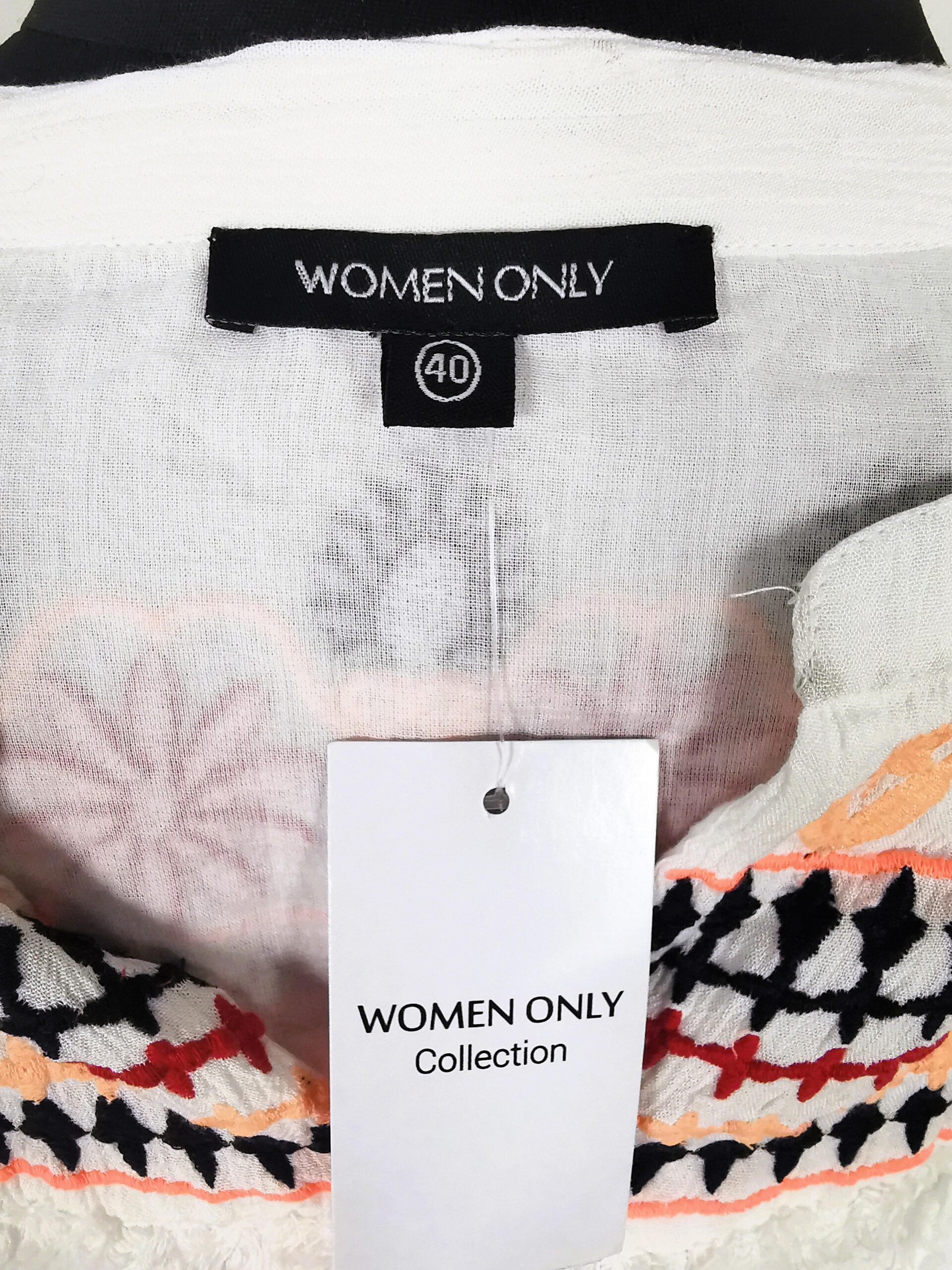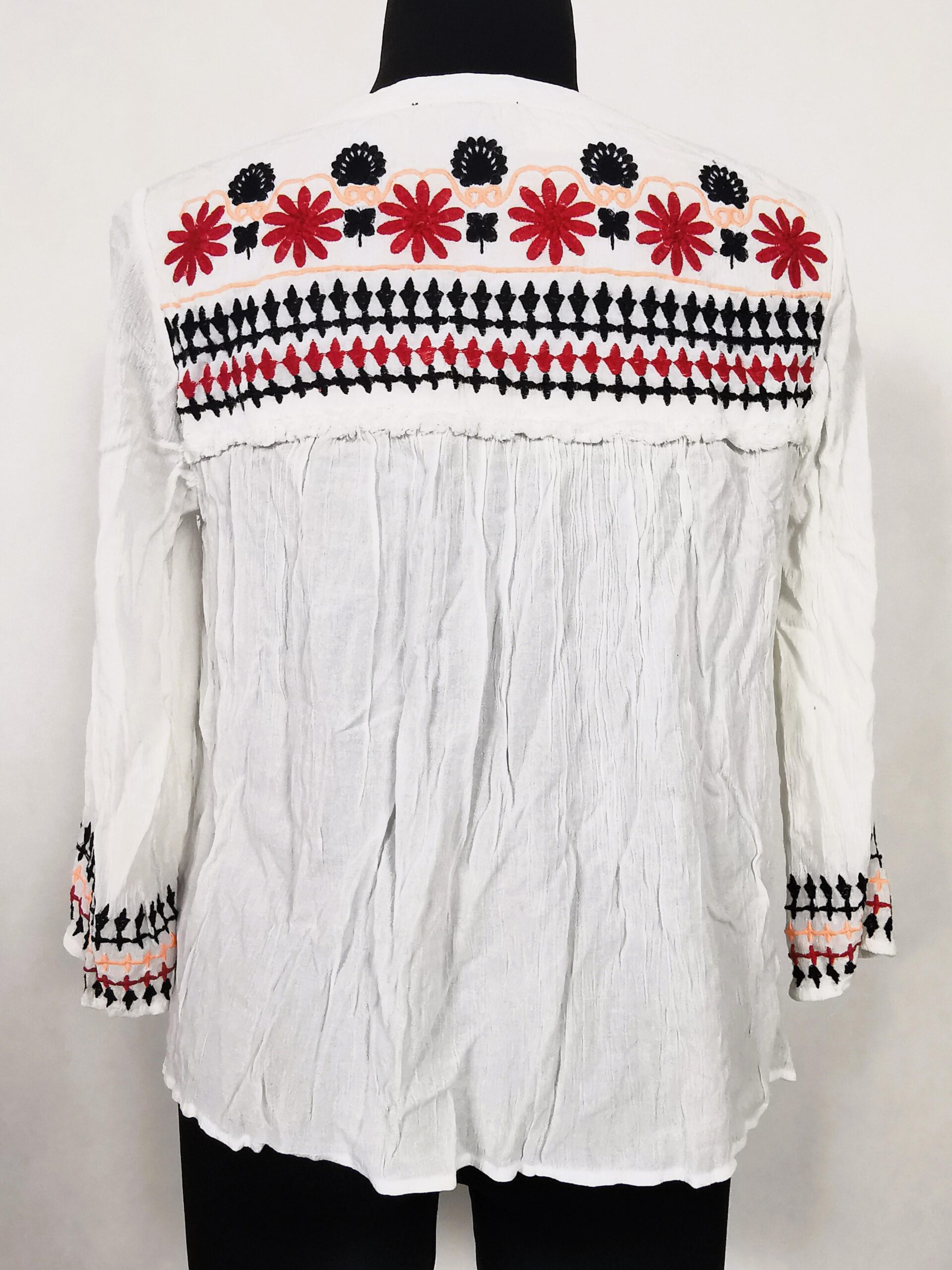 Biała narzutka z wyszywanymi kolorowymi wzorami, wiązana na sznurek z przodu.