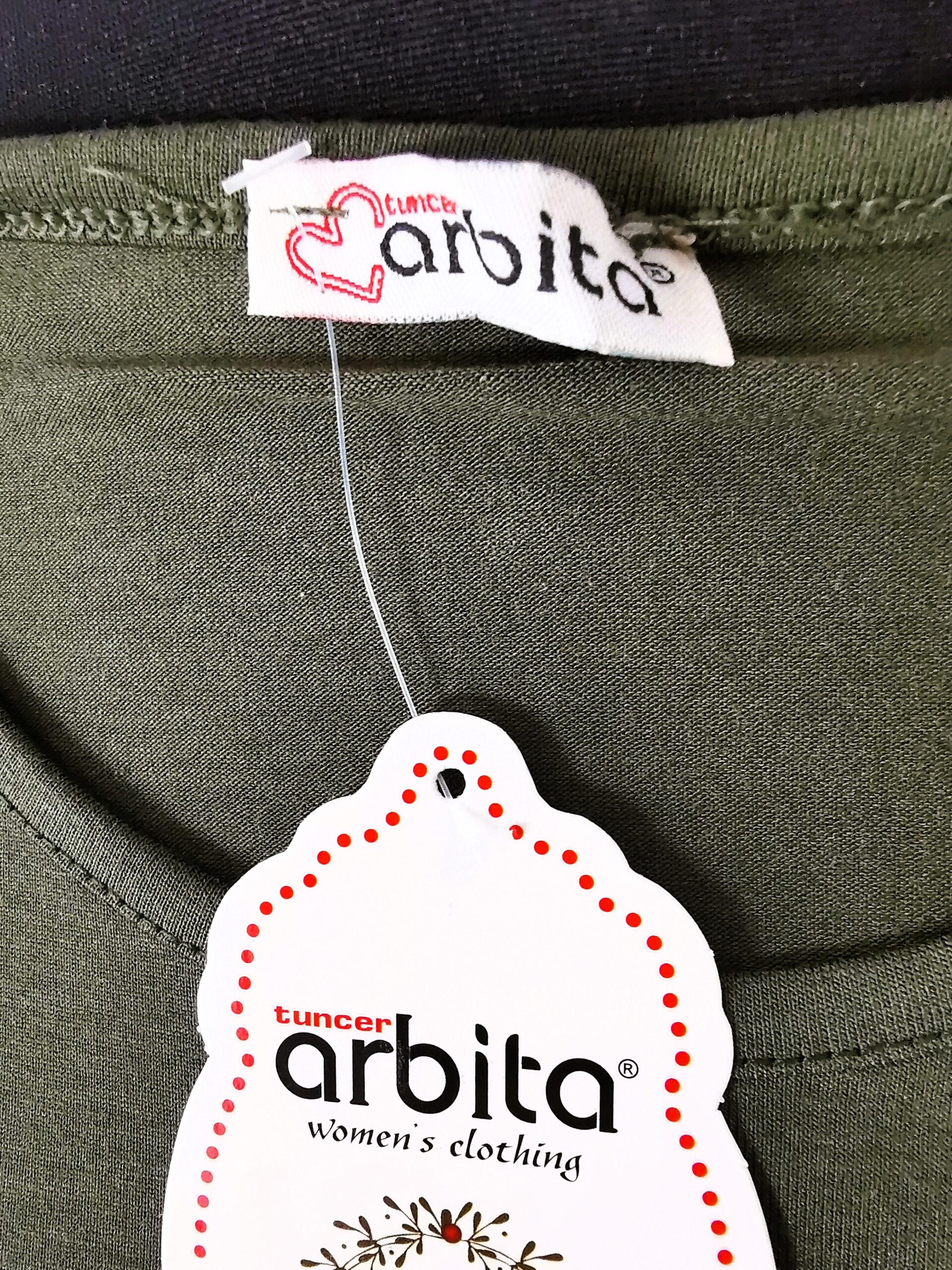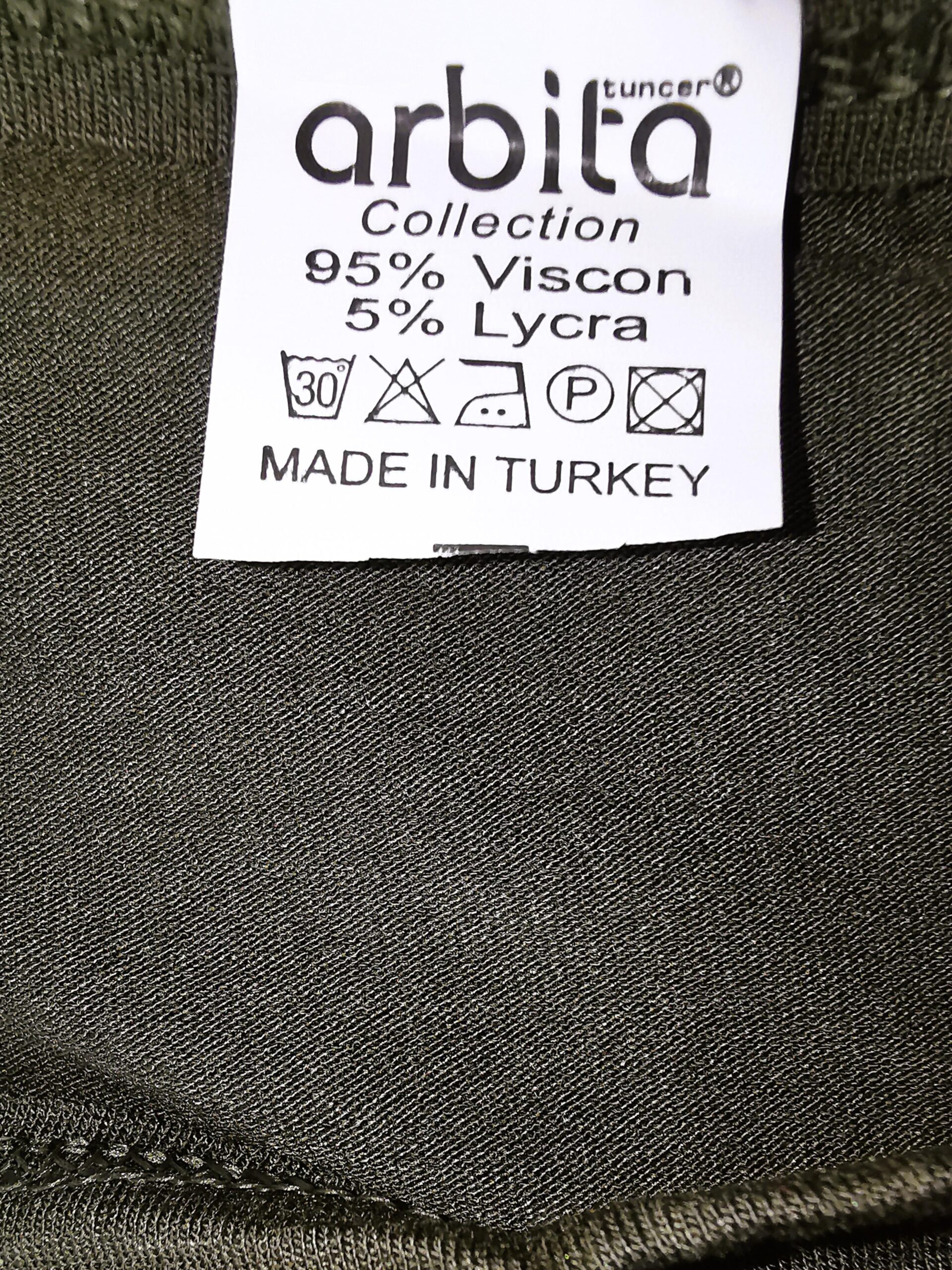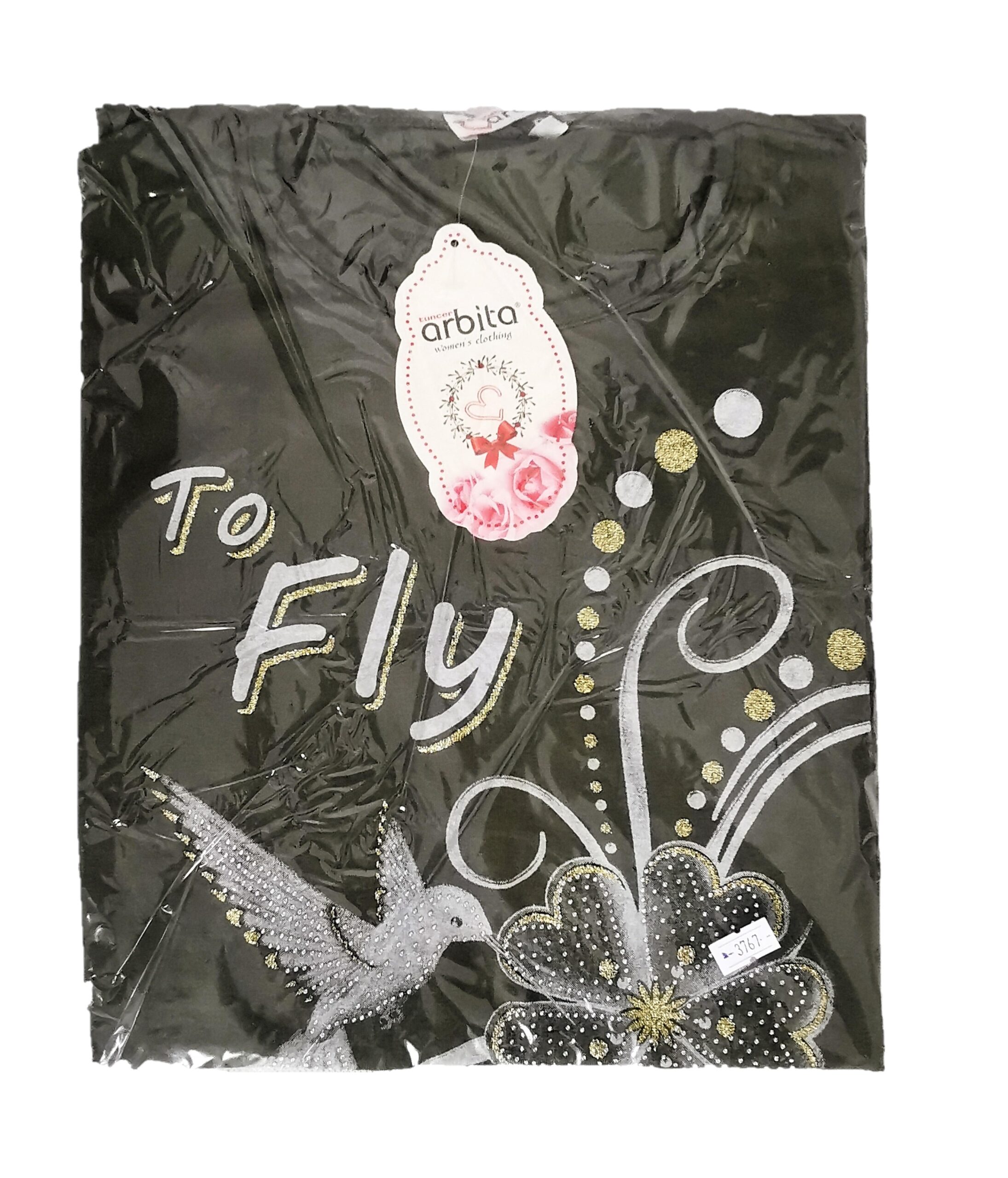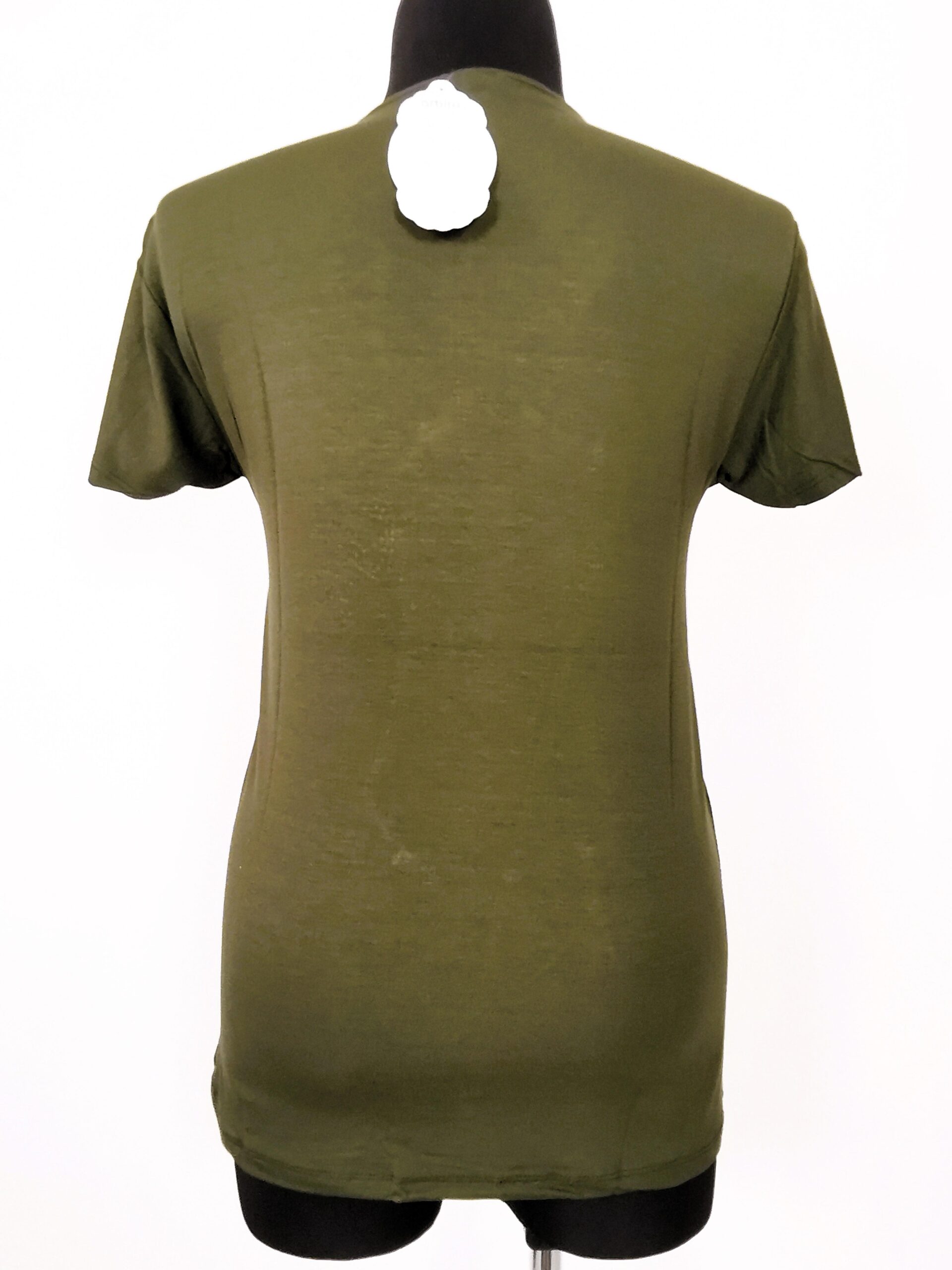 Oliwkowa bluzka na krótki rękaw z nadrukiem.