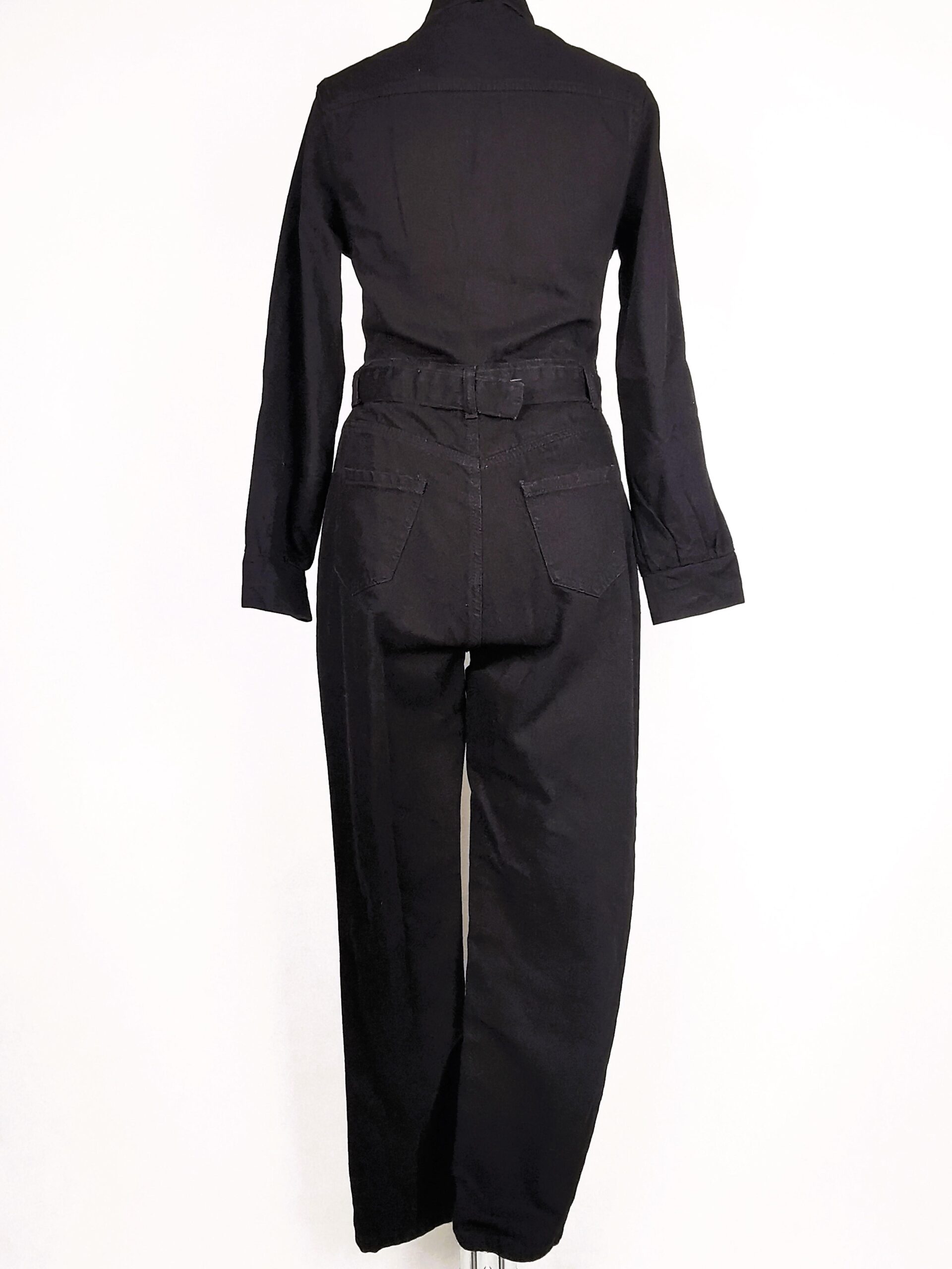 Czarny kombinezon na długi rękaw, zapinany na zamek z przodu.