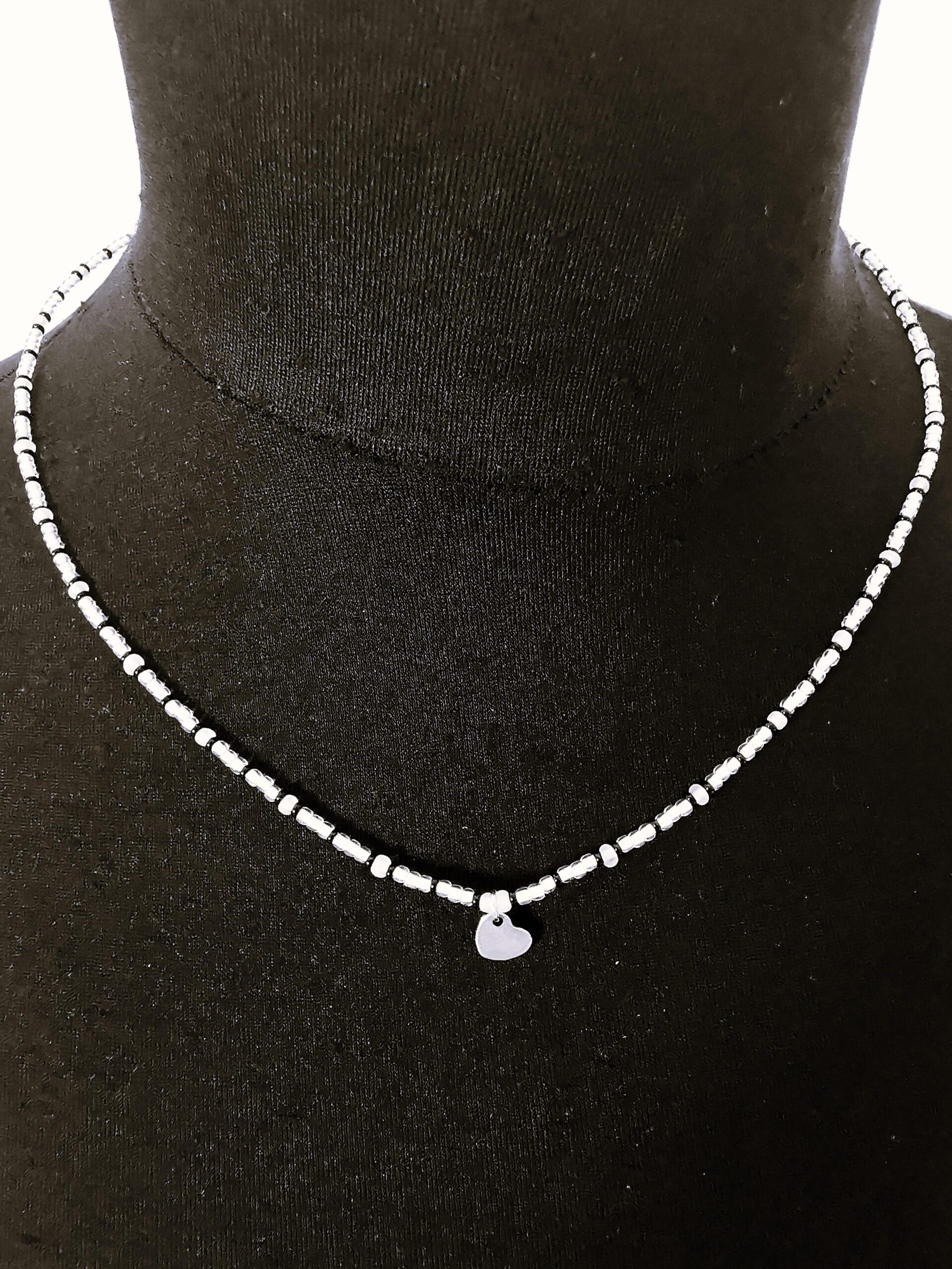 Naszyjnik wykonany na bazie z metalowego druciku z jasnymi koralikami przeplatanymi pojedynczymi ciemnymi koralikami, z serduszkiem ze stali szlachetnej.