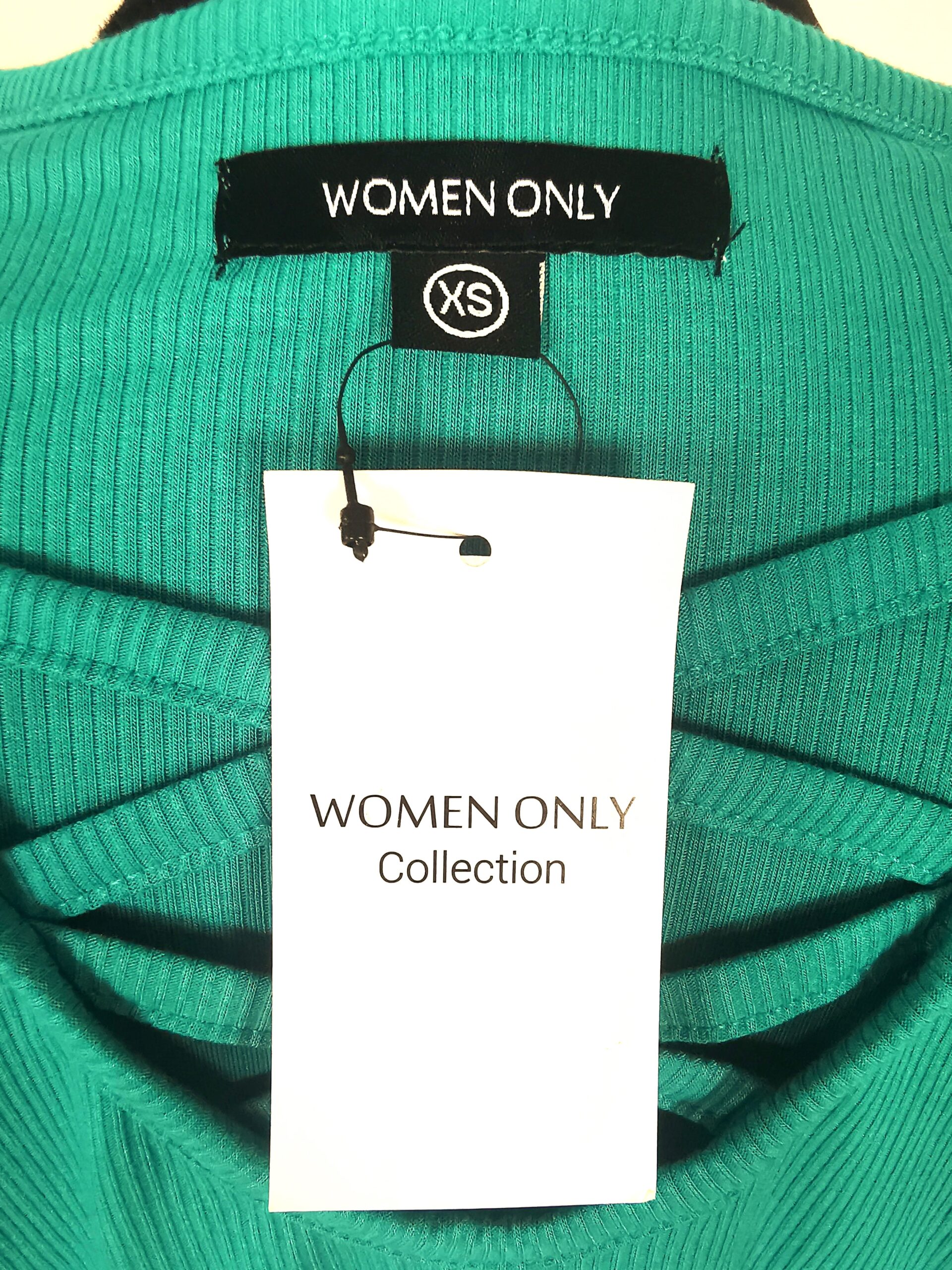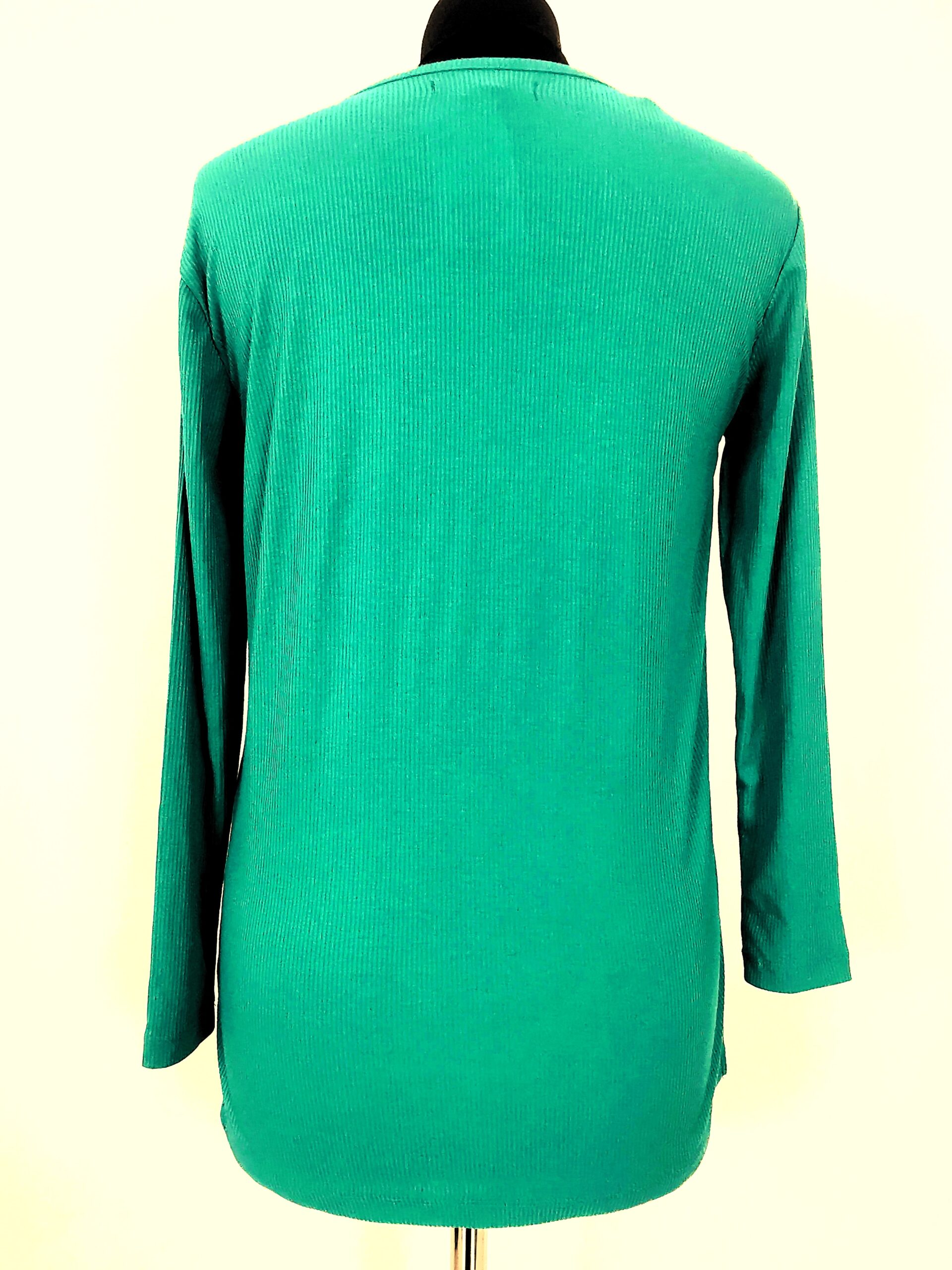 Turkusowa bluzka na długi rękaw z ozdobnym wiązaniem w dekolcie.